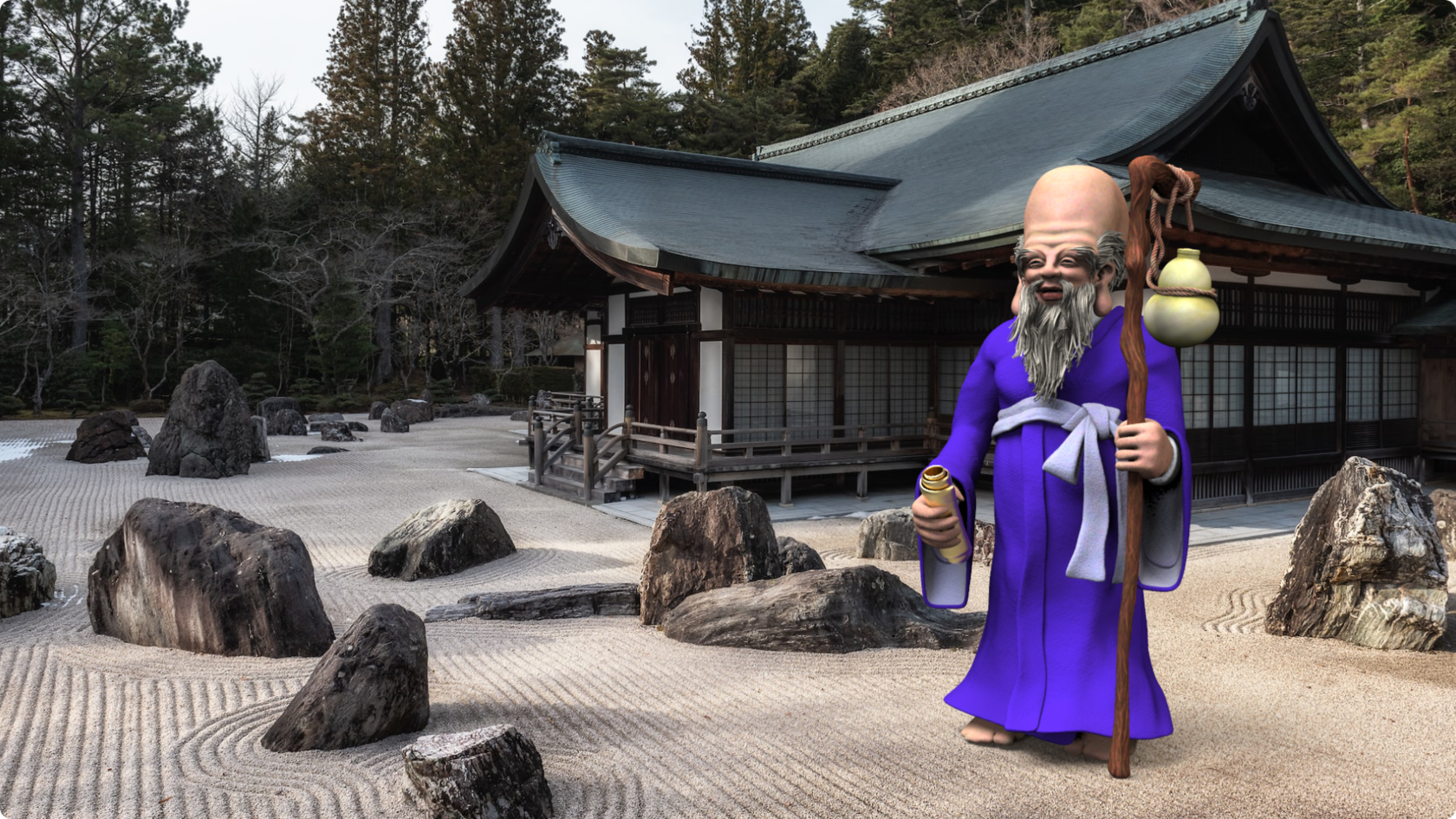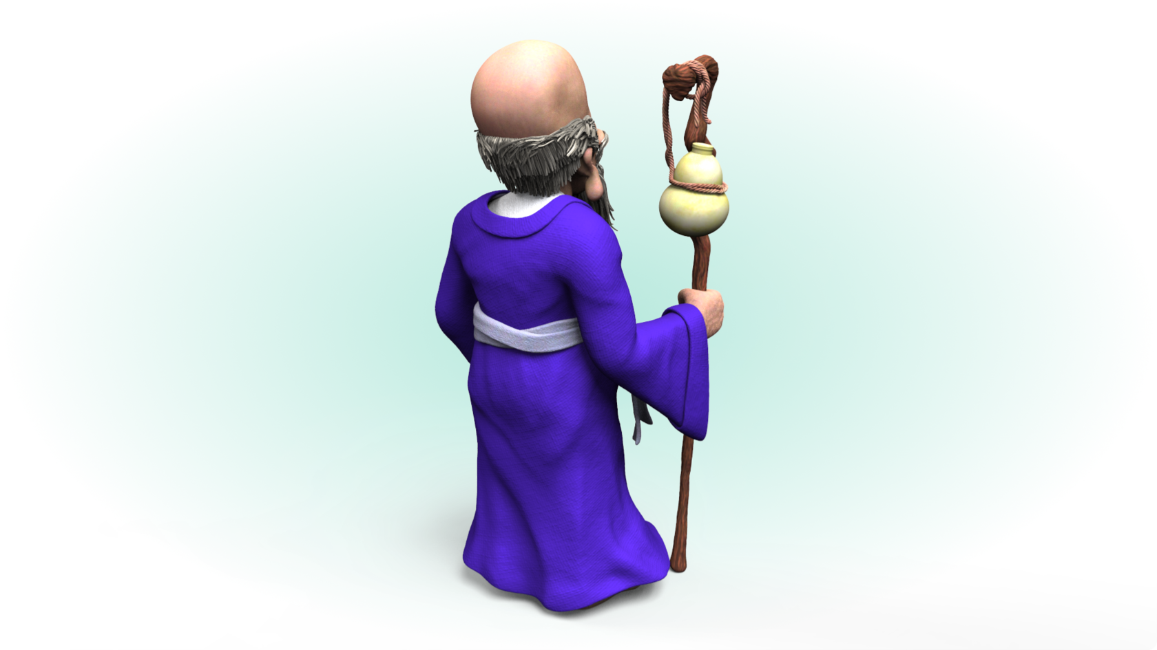В руке Фукурокудзю держит посох с прикрепленным к нему свитком.